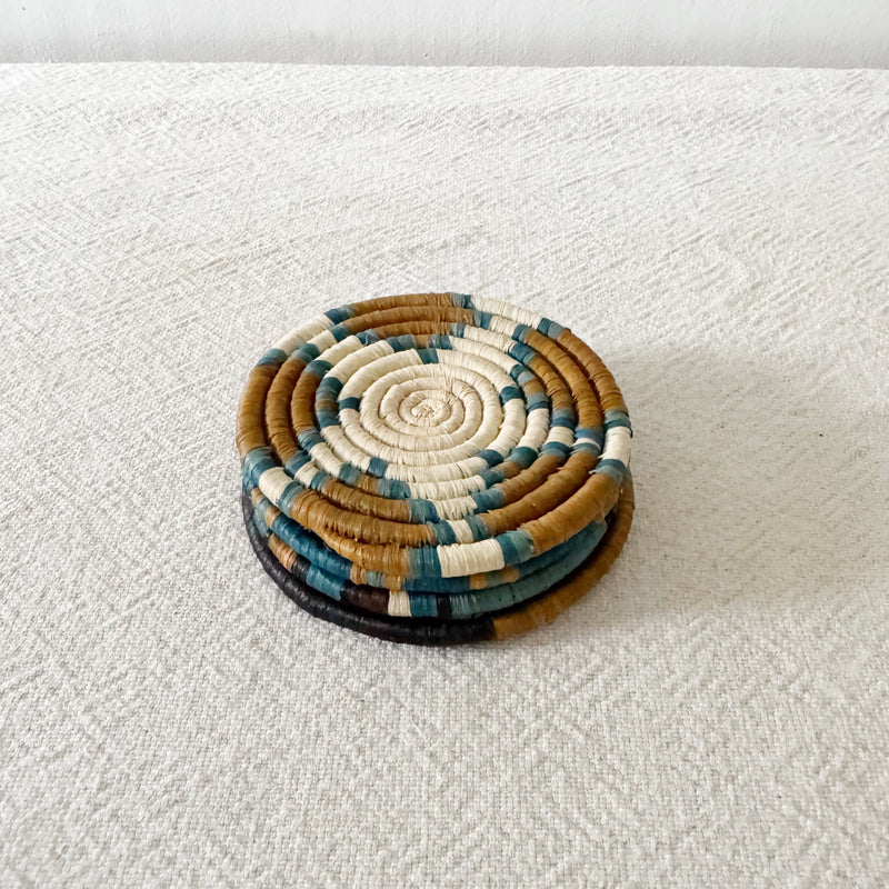 Add a fun touch to your barware or coffee table with this set of 4 woven coasters. They are special for entertaining and practical for everyday use! Each coaster is handmade in Rwanda, where female weavers hand-dye and weave together raffia and sweetgrass, a fragrant grass with a subtle sweetness.
