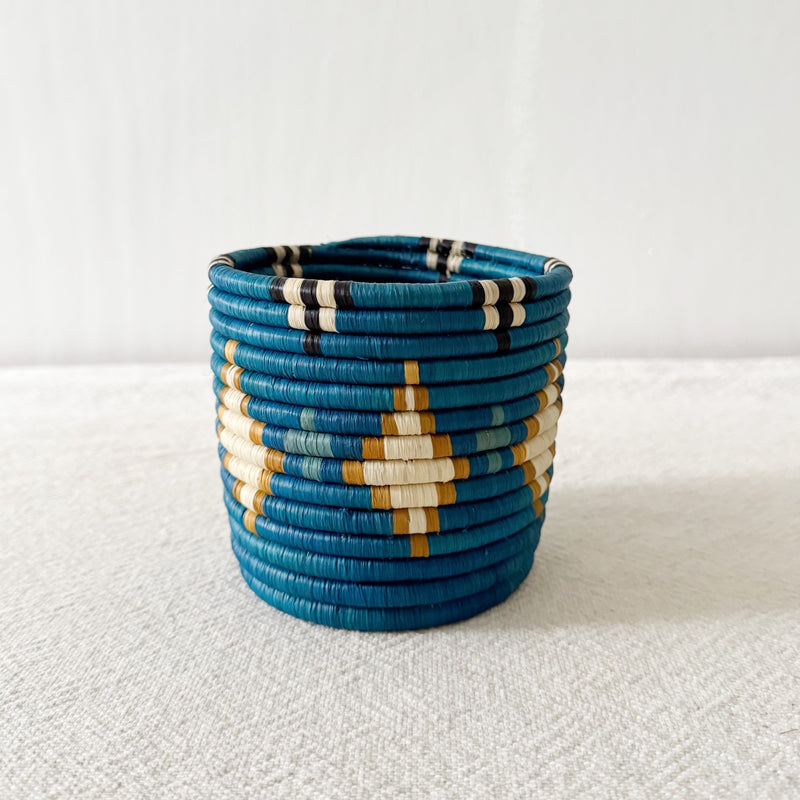 • These woven basket planters are handmade by our artisans in Gitarama, Rwanda. The women hand-dye and weave the fibers into these beautiful works of art. Raffia is woven around sweetgrass, a fragrant grass with a subtle sweetness. Use these African baskets as a desk accessory, a plant holder, or to brighten up a shelf! Plant not included.