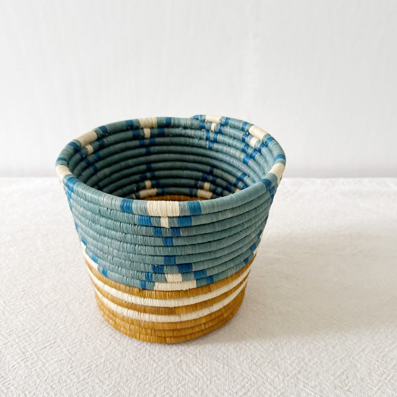 • This woven basket planter is handmade by our artisans in Gitarama, Rwanda. Raffia is woven around sweetgrass, a fragrant grass with a subtle sweetness. Use these African baskets as a desk accessory, a plant holder, or to brighten up a shelf! Plant not included. Holds a standard 6" pot.