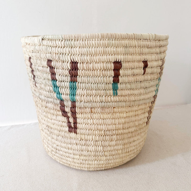 21.5" wide (top), 16" wide(base) x 18.5" tall. This palm basket is handwoven in Turkana, Kenya. It is very sturdy and great as toy storage, blanket storage, or to hold a large planter. Living in a very arid and harsh environment, we are proud to partner with women in this area who support their families through weaving.