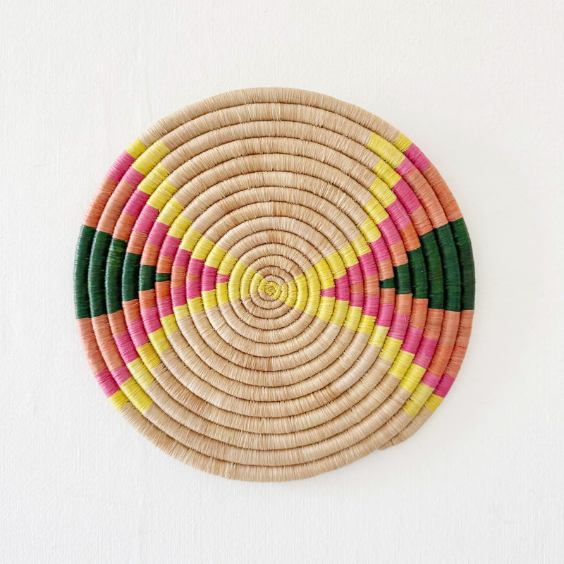 This woven trivet is handmade by our artisans in Gitarama, Rwanda in East Africa. Made from raffia and sweetgrass, it comes with a string attached to the back so that you can hang it on the wall. In addition to using it as a trivet, it can also be hung as wall art. You can combine them with other baskets or works of art to make a collage display.