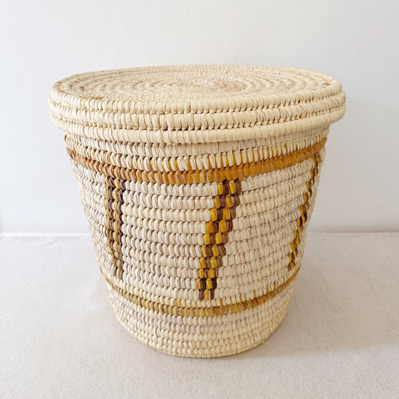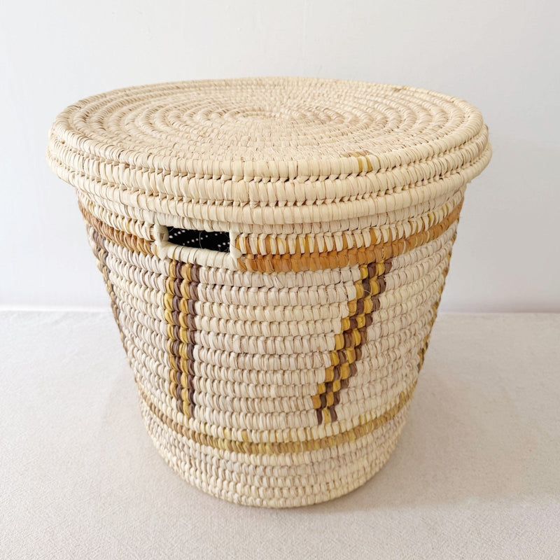 This beautiful, lidded palm basket is handwoven in Turkana, Kenya. It is very sturdy and great as a hamper, for toy storage, blanket storage, and as decor. Living in a very arid and harsh environment, we are proud to partner with women in this area who support their families through weaving.