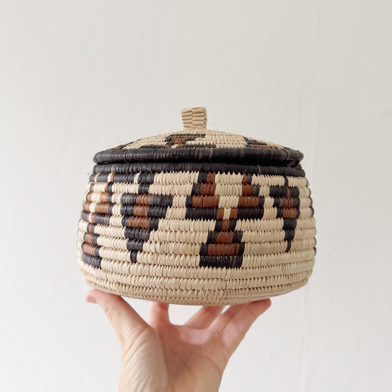 This traditional, lidded basket is woven in South Africa out of ilala palm and wild grasses. They are traditionally used to store home-brewed beer and liquids. It is naturally dyed using mud, leaves, ash, and plants. Each basket is one-of-a-kind and each one tells a story through its pattern.