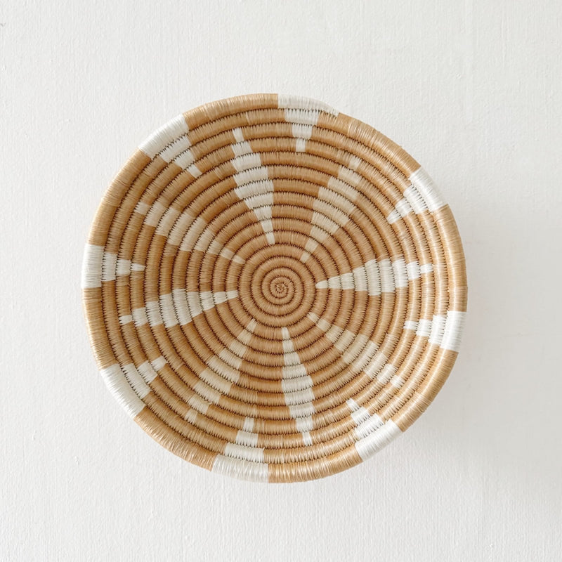 • This sisal, woven basket is approximately 8" in diameter and woven by our artisans in Gitarama, Rwanda. The women extract the sisal fibers from agave plants, then hand-dye and weave them into these beautiful works of art. The sisal is woven around sweetgrass, a fragrant grass with a subtle sweetness. Each sisal Rwandan basket comes with a string attached to the back so that you can hang it on the wall. In addition to making a beautiful table display, these baskets can also be hung as art. You can combine them with other baskets or works of art to make a feature wall collage.