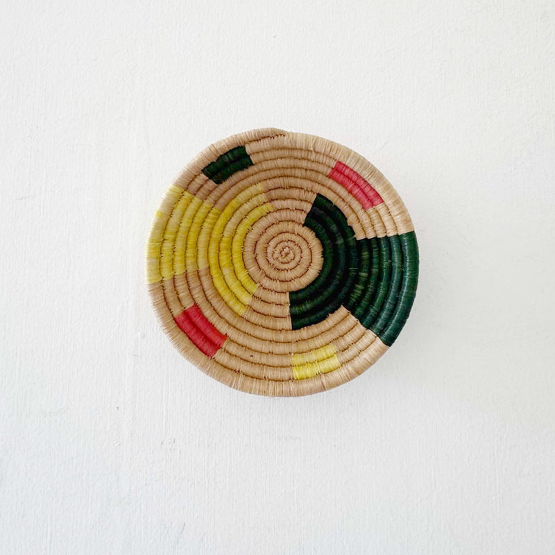 • This mini basket is cute for decor and practical.  It is 5" in diameter and a great mini catchall for holding jewelry, keys, and small items. It also has a loop on the back so that you can hang it on the wall. You can combine them with other baskets or works of art to make a mini wall collage. Made of raffia and sweetgrass