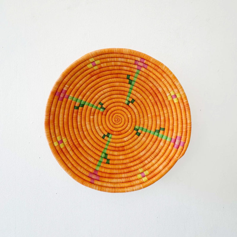 This woven bowl is handmade by our artisans in Gitarama, Rwanda in East Africa. Made from raffia and sweetgrass, it comes with a string attached to the back so that you can hang it on the wall. In addition to making a beautiful table display, these baskets can also be hung as wall art. You can combine them with other baskets or works of art to make a collage display.