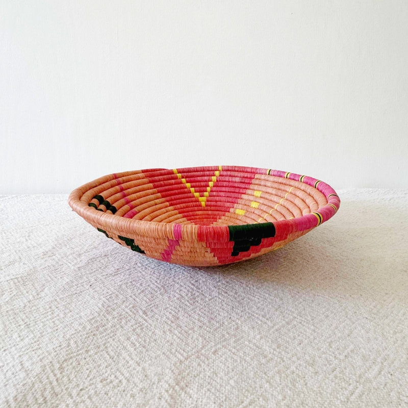This woven bowl is handmade by our artisans in Gitarama, Rwanda in East Africa. Made from raffia and sweetgrass, it comes with a string attached to the back so that you can hang it on the wall. In addition to making a beautiful table display, these baskets can also be hung as wall art. You can combine them with other baskets or works of art to make a collage display.