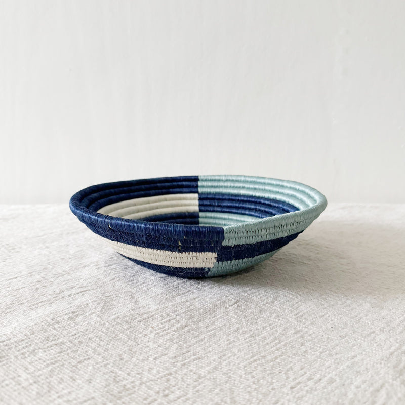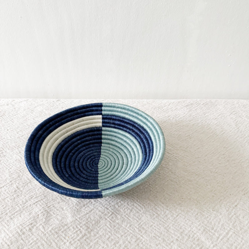 This sisal, woven basket is approximately 8" in diameter and woven by our artisans in Gitarama, Rwanda. The women extract the sisal fibers from agave plants, then hand-dye and weave them into these beautiful works of art. The sisal is woven around sweetgrass, a fragrant grass with a subtle sweetness. Each sisal Rwandan basket comes with a string attached to the back so that you can hang it on the wall. In addition to making a beautiful table display, these baskets can also be hung as art. You can combine them with other baskets or works of art to make a feature wall collage.
