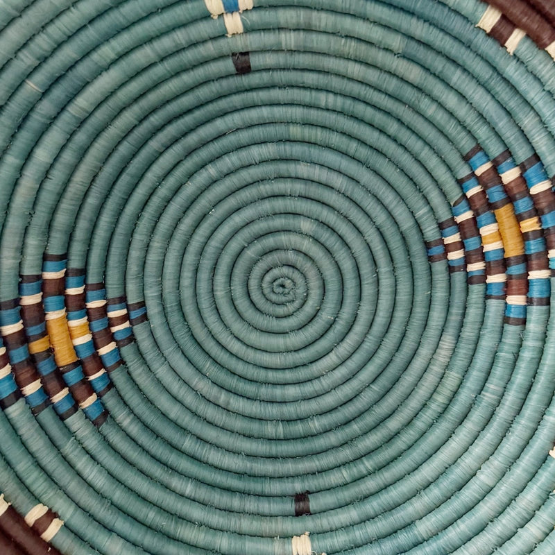 This woven bowl is handmade by our artisans in Gitarama, Rwanda in East Africa. Made from raffia, banana bark, and sweetgrass, it comes with a string attached to the back so that you can hang it on the wall. In addition to making a beautiful table display, these baskets can also be hung as wall art. You can combine them with other baskets or works of art to make a collage display.
