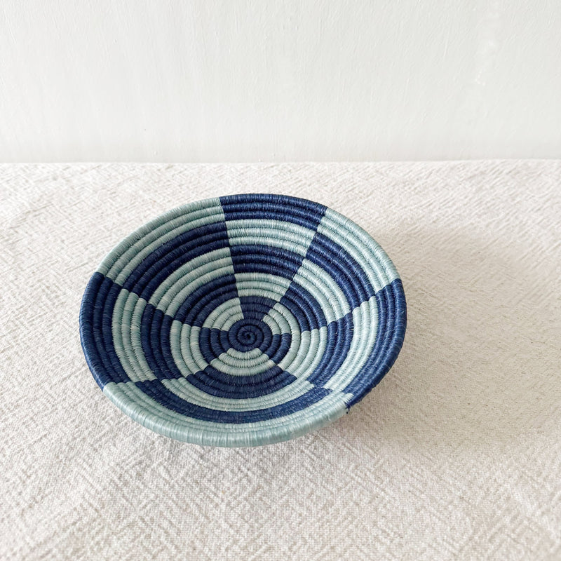 This sisal, woven basket is approximately 8" in diameter and woven by our artisans in Gitarama, Rwanda. The women extract the sisal fibers from agave plants, then hand-dye and weave them into these beautiful works of art. The sisal is woven around sweetgrass, a fragrant grass with a subtle sweetness. Each sisal Rwandan basket comes with a string attached to the back so that you can hang it on the wall. In addition to making a beautiful table display, these baskets can also be hung as art. You can combine them with other baskets or works of art to make a feature wall collage.