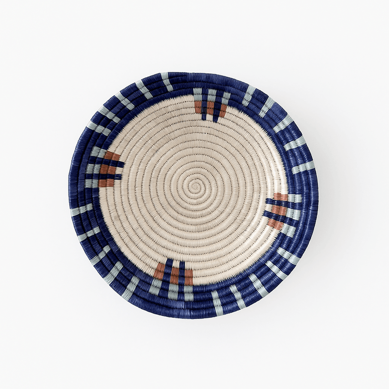 This sisal, woven basket is approximately 8" in diameter and woven by our artisans in Gitarama, Rwanda. The women extract the sisal fibers from agave plants, then hand-dye and weave them into these beautiful works of art. The sisal is woven around sweetgrass, a fragrant grass with a subtle sweetness. Each sisal Rwandan basket comes with a string attached to the back so that you can hang it on the wall. In addition to making a beautiful table display, these baskets can also be hung as art. You can combine them with other baskets or works of art to make a feature wall collage.