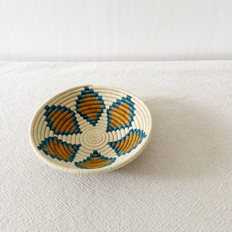 This woven bowl is handmade by our artisans in Gitarama, Rwanda in East Africa. Made from raffia, banana bark, and sweetgrass, it comes with a string attached to the back so that you can hang it on the wall. In addition to making a beautiful table display, these baskets can also be hung as wall art. You can combine them with other baskets or works of art to make a collage display.